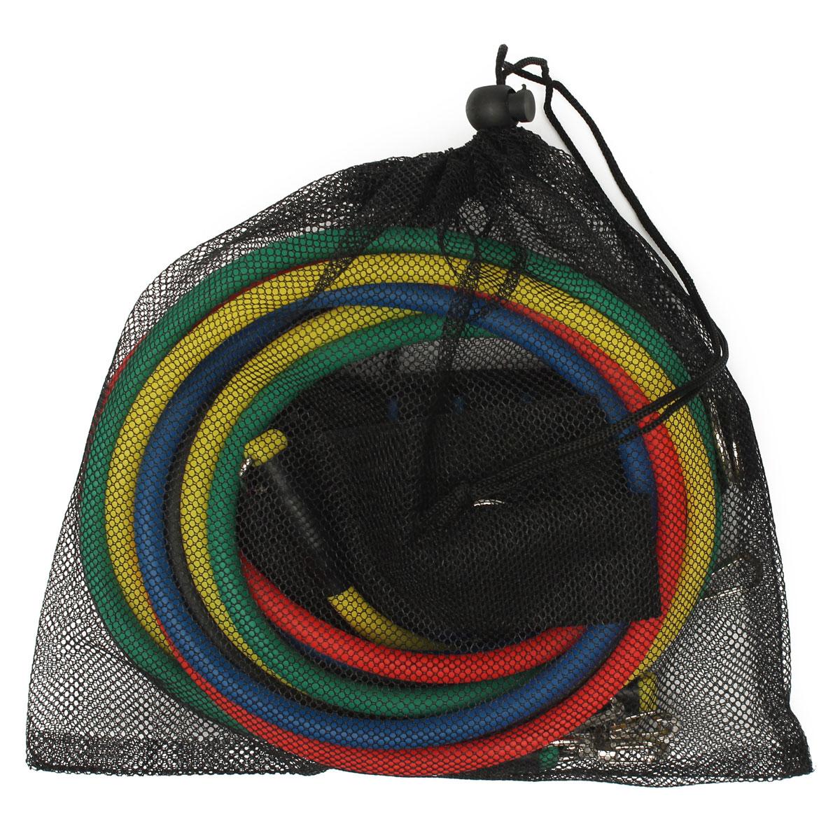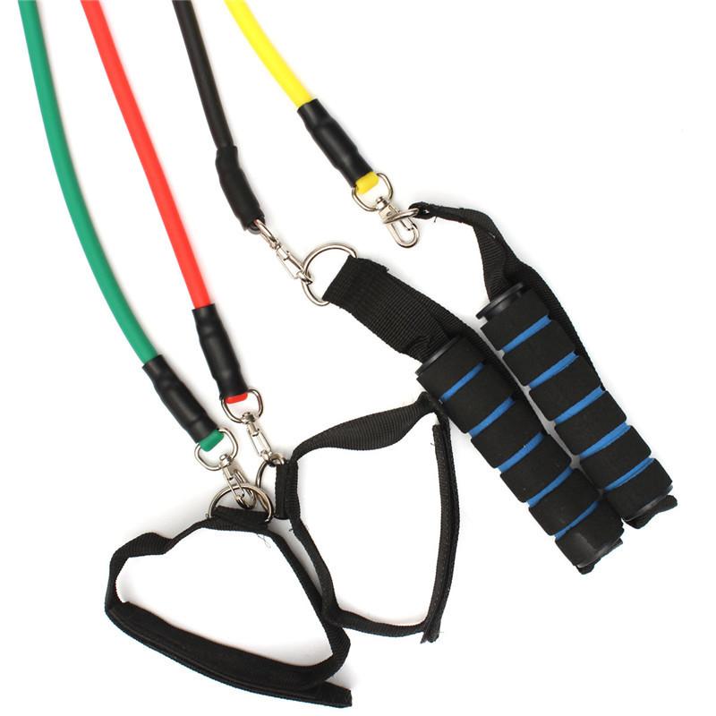 you don't have time to hit the gym or if you're looking for an easy way for a quick workout, this 11 piece resistance band workout Set is perfect for you! With the different color bands, you can adjust the intensity of your workout. Each color's resistance varies, with yellow being the lightest (15 lbs) and black being the heaviest (35 lbs). The foam handles provide sturdy and comfort, while the two different anchors allow you to strap the bands to your ankles or door.